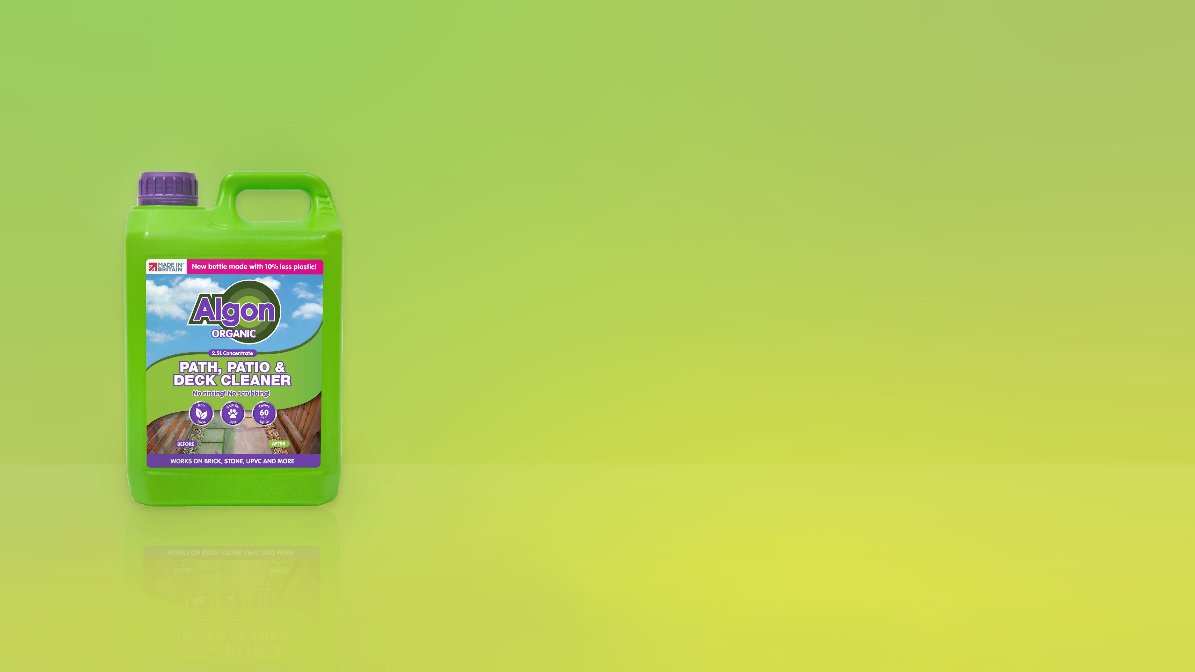 Revitalise your patio, paths, and other outdoor surfaces the easy and environmentally friendly way with Algon Organic Patio Cleaner. Our concentrated formula offers a simple yet effective solution to common outdoor cleaning problems like dirt, grime and more all without the need for strenuous scrubbing or rinsing.