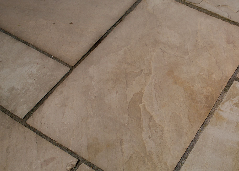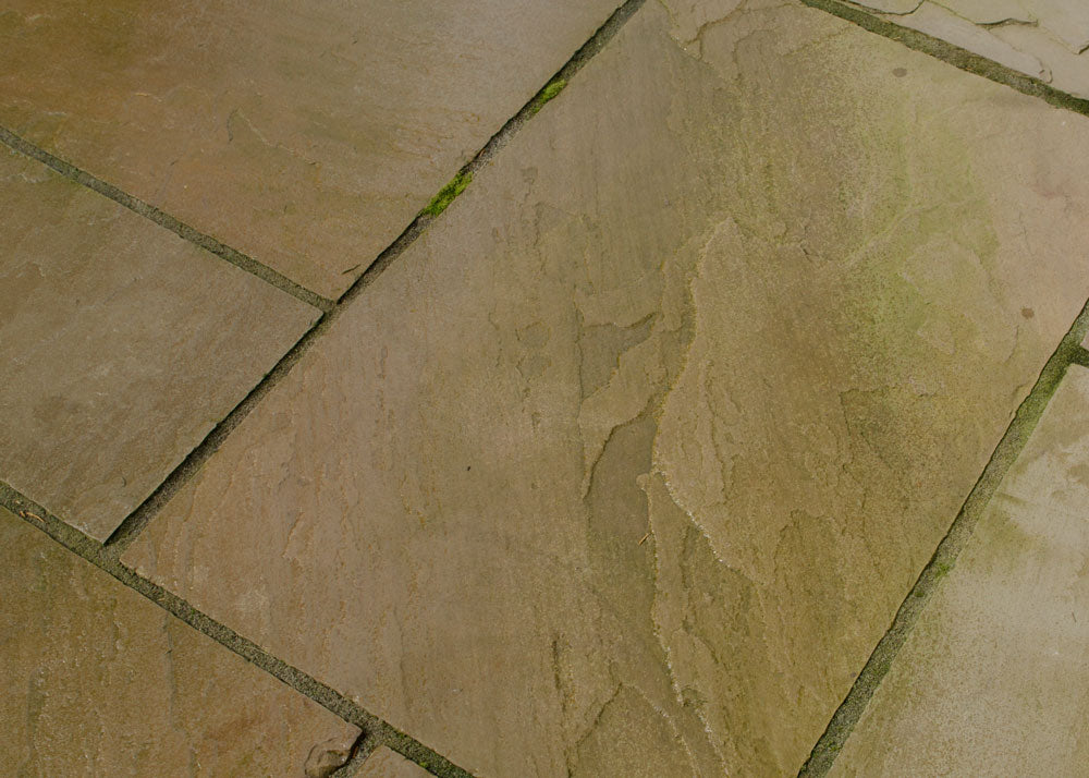 This close-up of patio paving shows natural sandstone tones of yellow and brown muted by a layer of green. The growth, most visible across the upper and right sections, dulls the stone’s vibrancy and leaves the surface looking discoloured and untidy.